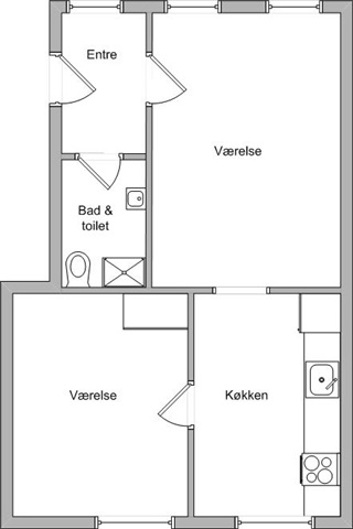 52 m2 stor 2 værelses lejlighed.Lejligheden har entre, værelse og nyere køkken med komfur og køleskab m/frost, samt værelse med indbyggede skabe,der er trægulve i hele lejligheden.