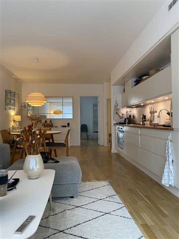 Lejligheden fremstår lys og moderne med to separate soveværelser, en åben planløsning mellem køkken og stue samt et rummeligt badeværelse.
