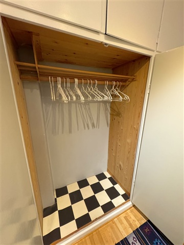 Værelset er indrettet med seng, skrivebord, stol, opbevaringsplads til tøj, bøjler samt belysning.