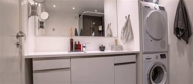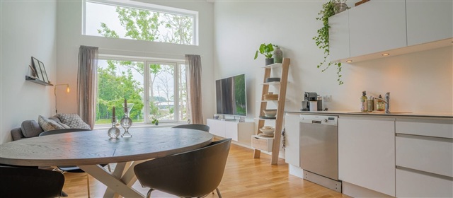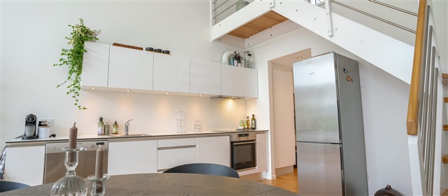Denne lejlighed præsenterer et særdeles lyst miljø takket være de store vinduespartier og er gennemført med materialer af høj kvalitet overalt. Samtlige lejemål er udstyret med moderne hårde hvidevarer samt et tidløst badeværelse, hvor gulvvarme sikrer komfort. På i alt 79 kvadratmeter er boligen indrettet med tre værelser fordelt på to plan, og i det åbne køkken-alrum er der en loftshøjde på hele fem meter. Fra stuen leder en trappe op til et rummeligt, åbent værelse, der har udsyn over stueområdet, samt udgang til en stor altan på 9 kvadratmeter.Det skal bemærkes, at de anvendte billeder ikke nødvendigvis forestiller netop denne lejlighed, men er referencebilleder af en tilsvarende boligtype i samme standard. Der kan derfor forekomme forskelle i placeringen af vinduer, altan eller terrasse samt radiatorer, ligesom udsigten kan variere afhængigt af den konkrete lejligheds beliggenhed. Vi anbefaler derfor altid en fremvisning for at sikre, at du får et præcist indtryk af den pågældende bolig. Interessenter opfordres til at kontakte vores udlejningsafdeling.