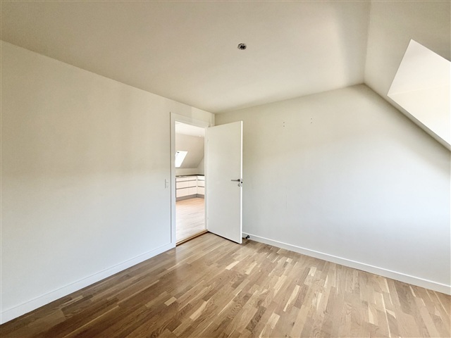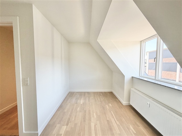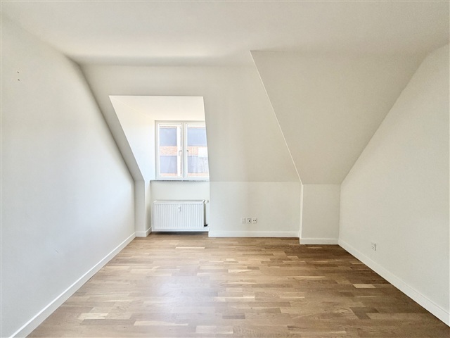 Fra køkken-alrummet er der direkte adgang til et godt soveværelse eller værelse, ligesom der er en trappe, der leder op til den anvendelige hems på 10 m². Lejligheden har flotte parketgulve, og bygningen er udstyret med dørtelefon, kælderrum, fælles vaskeri samt en nyligt anlagt gårdhave og dejlige fællesarealer.
