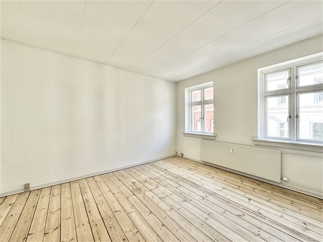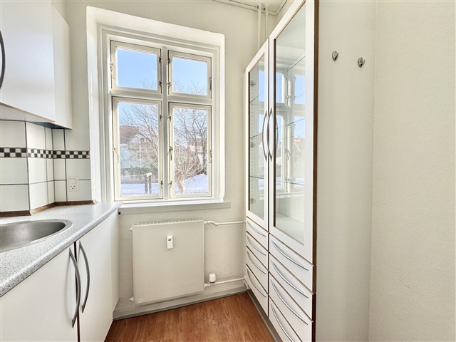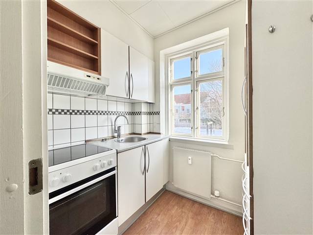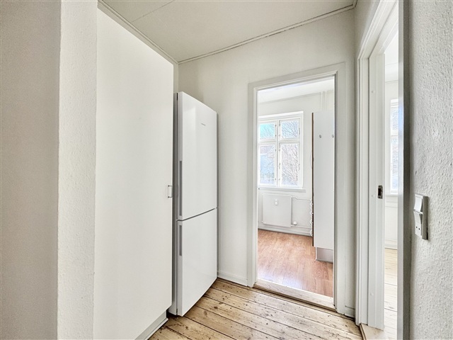 Inden for Fredericias voldanlæg udbydes en charmerende lejlighed med to værelser, beliggende på første sal og med et samlet areal på 46 m².Boligen indeholder en lys og indbydende stue samt et behageligt soveværelse. Badeværelset er udstyret med brus, og gulvene er flotte plankegulve, hvilket tilføjer en varm atmosfære. Ejendommen har desuden dørtelefon, fælles vaskefaciliteter samt et privat kælderrum. Bag ejendommen findes en dejlig, fælles have og gårdmiljø, som kan benyttes af beboerne.