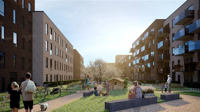 De kontrastfyldte bygninger i Lerholmen er tegnet af DesignGroup Architects, som har skabt en moderne ejendom. Ejendommen består af 7 bygninger centreret omkring et stort grønt gårdrum med masser af plads til både leg og afslapning. Her finder du både sociale rum med pavillon og bålplads, hvor du kan samle familie, venner og naboer. Du finder også private og rolige hyggekroge, hvor du kan slappe af med en bog i de grønne omgivelser. Her kommer også en boldbane, hvor man kan få sved på panden. Bygningerne i Lerholmen er opført i forskellige højder, hvilket sikrer et optimalt lysindfald samt en skøn udsigt for alle ejendommens boliger. Lerholmens største bygning er med til at danne byporten ind til Nærheden, den skønne nye bydel som bliver dit nabolag. Alle hjem i Lerholmen er skabt med mennesket i fokus og fremtidssikrerede. Alle boliger er forsynet med eget ventilationsanlæg med høj virkningsgrad, hvilket er med til at sikre et energivenligt byggeri. Gårdhaven vandes med opsamlet regnvand, og alle bygninger opføres til opfyldelse af energiklasse A2020. Bygningen er udstyret med lavtemperatur fjernvarme, som sikrer en varmeforsyning der reducerer påvirkningen på miljøet. Herudover er bygningerne i Lerholmen forsynet med solceller på tagene. Ejendommen er også udstyret med elevator og dørtelefon i alle bygninger – og til hver lejlighed tilhører et depotrum med plads til opbevaring. Uanset om du kører i delebiler eller egen bil, er der plads til at parkere nær lejligheden i det nybyggede P-hus. I gården er der desuden parkeringspladser til både cykler og ladcykler.
