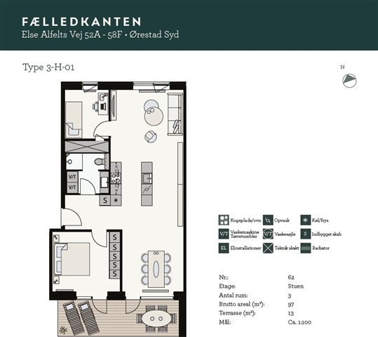 3 værelses lejlighed med 13 m2 stor terrasse