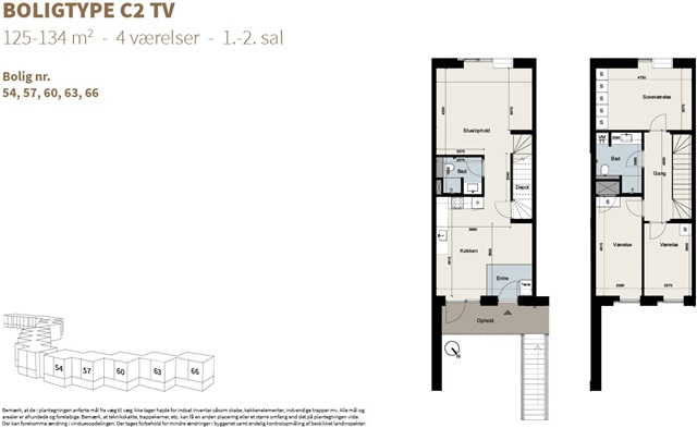 Boligtypen C2 er designet til at rumme forskellige former for familier og tilbyder generøst med plads både på stueetagen og på første sal. Det åbne, lyse alrum er udstyret med et elegant HTH-køkken, der inkluderer Siemens hårde hvidevarer af høj kvalitet.I stueplan findes et gæstetoilet, mens første sal rummer tre separate værelser samt et badeværelse. Boligen præges af et stort lysindfald gennem omfattende vinduespartier, er forsynet med gulvvarme og indbyggede skabe, som bidrager til et ryddeligt og funktionelt hjem.