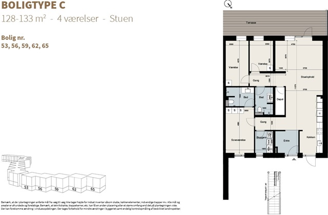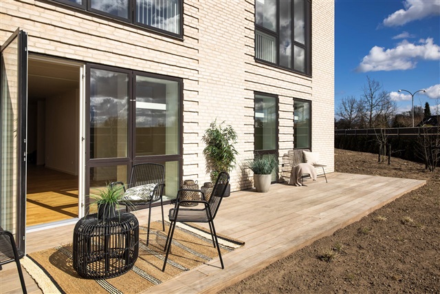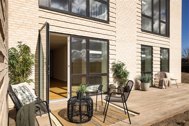 De rummelige C-boliger passer godt til seniorer, børnefamilier eller par, som ønsker god plads til daglig udfoldelse. Alle boligerne er placeret på stueetagen.Man træder ind gennem en flisebelagt entré, som giver adgang til bryggerset samt det åbne og lyse køkken/alrum/stue, hvor der er installeret elegante HTH-køkkener og Siemens hårde hvidevarer. Fra opholdsrummet er der udgang til en stor terrasse, der vender mod sydvest.