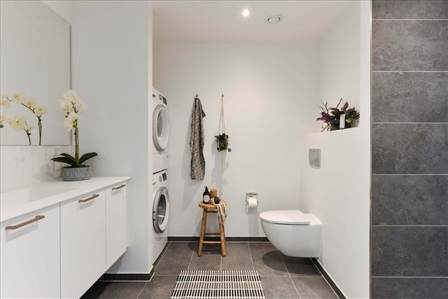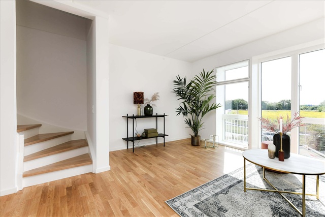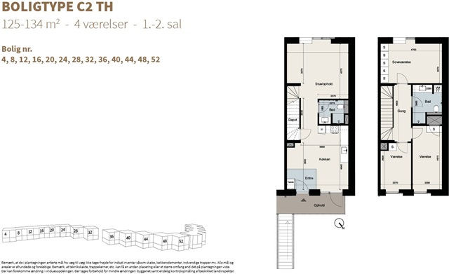 Boligtypen C2 er velegnet til forskellige familiekonstellationer og tilbyder generøs plads både i stueetagen og på førstesalen. Det åbne køkken-alrum bades i lys og er udstyret med et stilfuldt HTH-køkken samt integrerede Siemens-hårde hvidevarer.I stueplan finder man et gæstetoilet, mens førstesalen rummer tre værelser samt et badeværelse. Boligen fremstår lys og inviterende takket være de store vinduespartier, og der er installeret gulvvarme samt indbyggede skabe for ekstra opbevaringsplads.