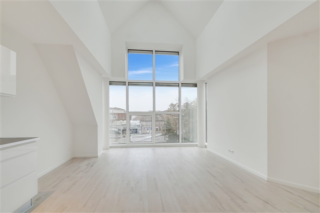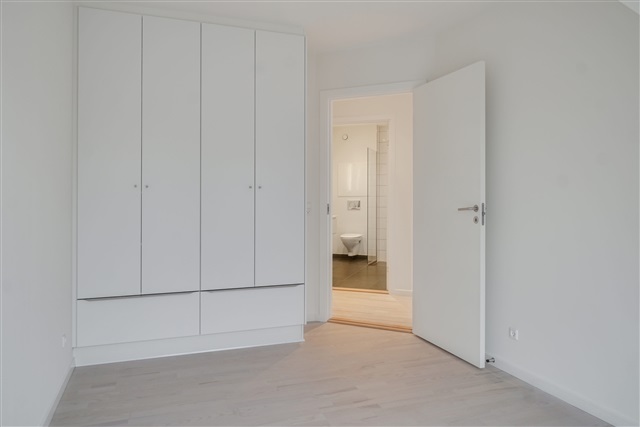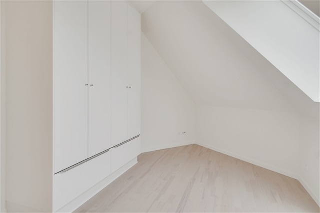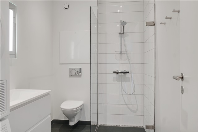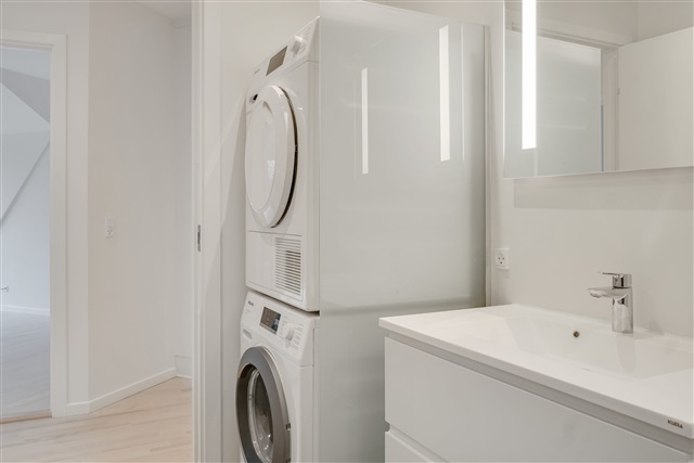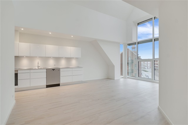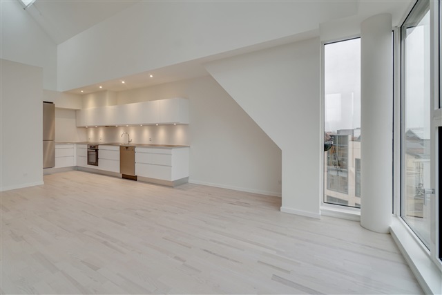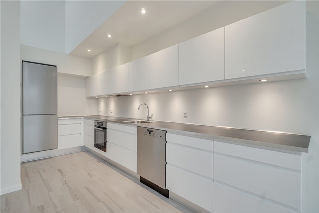 Køkkenet er udført i højglans og indeholder alle nødvendige hårde hvidevarer af mærket Miele, herunder opvaskemaskine. Det åbner op mod en lys og indbydende stue, der er prydet med en stor glaskanap og dekorative søjler. I hele lejligheden ligger smukke parketgulve, og der er installeret gulvvarme.