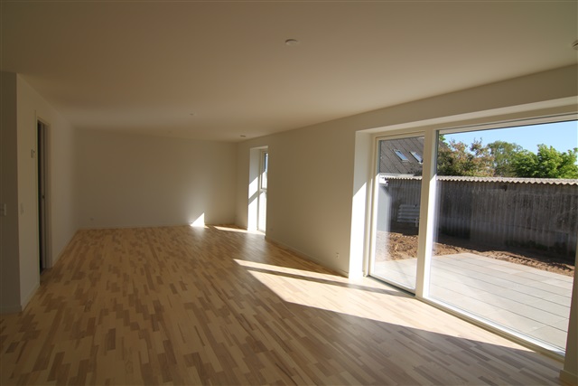 Selve boligen er placeret længst fra vejen. Det hele er lyst og nyt på 107 kvm.