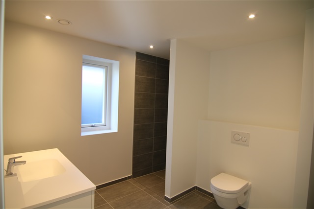 Entre/bryggers og badeværelse er udlagt med store klinker. Væghængt toilet med soft close. Klinker i bruseniche. Fast badmiljø med håndvask og spejl.
