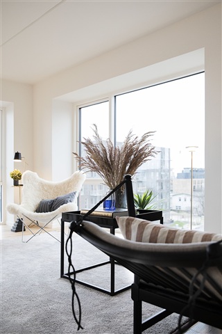 Boligen byder på en indretning bestående af en entré udstyret med både skab og bøjlestang, to veludnyttede sove- eller børneværelser samt et eksklusivt brusebadeværelse, hvor både vaskemaskine og tørretumbler er installeret. Køkkenet fremstår i åben forbindelse med stuen og sikrer en gennemgående sammenhæng i opholdsrummet. Lejligheden er designet med fokus på et stort naturligt lysindfald, hvilket understreges af de brede vinduespartier og de flotte egetræsgulve. Et Invita-køkken af høj kvalitet pryder rummet og bidrager til boligens samlede udtryk.Foruden dette har boligen et eget klimaanlæg og er forsynet med gulvvarme overalt, hvilket betyder, at der ikke er behov for radiatorer, når møbleringen planlægges. Til boligen hører desuden en altan samt et separat kælderrum til opbevaring. Ejendommen er udstyret med elevator, og parkering kan løses ved leje af en plads i parkeringskælderen. Det er muligt at få tilladelse til at holde både hund eller kat i lejligheden.