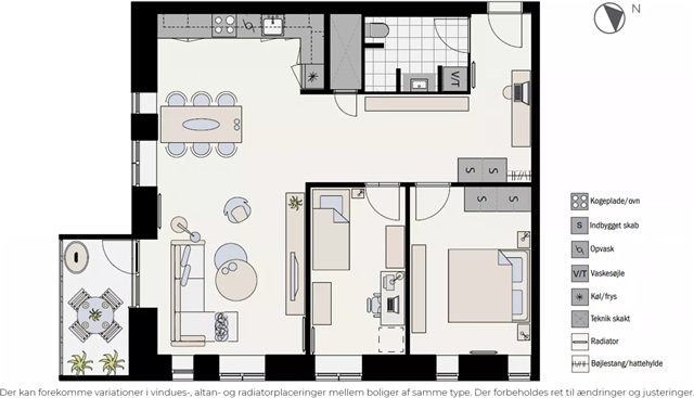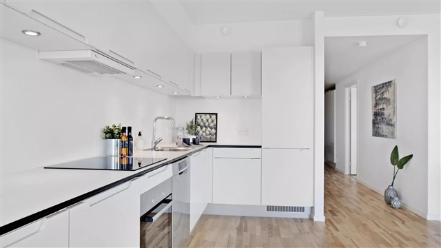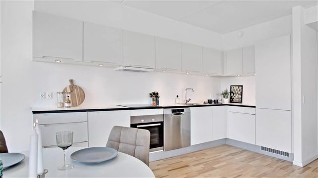 LejlighedenLejligheden fremstår lys og rummelig med åbent køkken og dagligstue i samme centrale rum. Det hvide køkken, med integrerede greb, er fra Invita og indeholder desuden hårde hvidevarer fra Bosch. På badeværelset er der vaskesøjle med vaskemaskine og tørretumbler, også fra Bosch. Boligen er orienteret således at man får mest muligt lysindfald, hvilket skaber et flot spil på det lyse gulv i ask. Det er muligt at ansøge om husdyrtilladelse i alle vores lejemål. OBS: ønskes der mål af lejligheden skal du selv huske opmålings udstyr til fremvisning, da der ikke er mål på plantegningen.