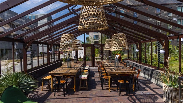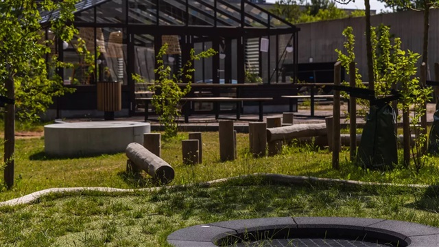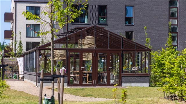 Mellem bygningerne ligger to indbydende gårdrum, der både opfordrer til ro og til leg. Beplantningen er nøje udvalgt for at give variation og blomstring hele året, så udeområderne altid fremstår attraktive. Det fælles orangeri er beregnet til at kunne rumme både familiesammenkomster og fællesmåltider med naboerne.