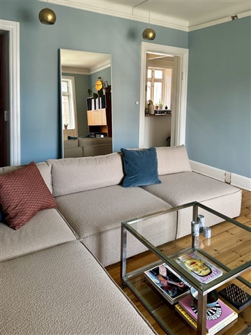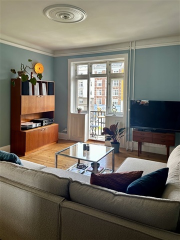 Selve lejligheden er 100 m² stor og byder på et nyligt renoveret køkken og badeværelse samt en rummelig stue med adgang til altan. Boligen deles med to andre beboere: Rebecca på 30 år, der studerer, og Emil på 29 år, som er selvstændig og typisk ude af lejligheden mandag til torsdag på grund af arbejde. Hjemmet beskrives som roligt, rent og velordnet.