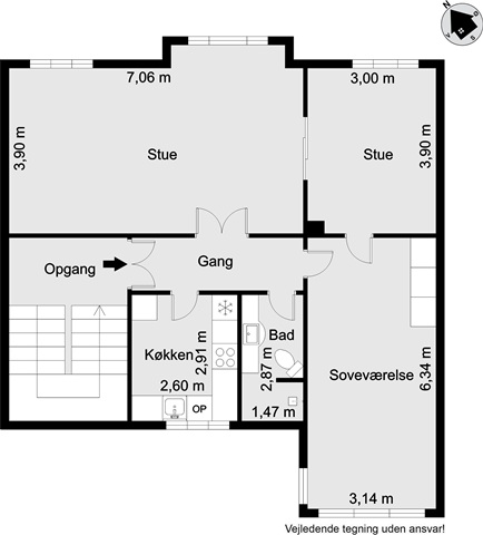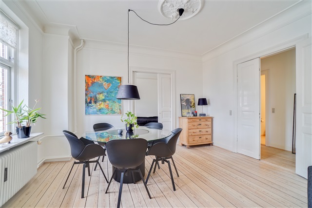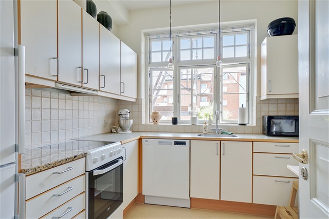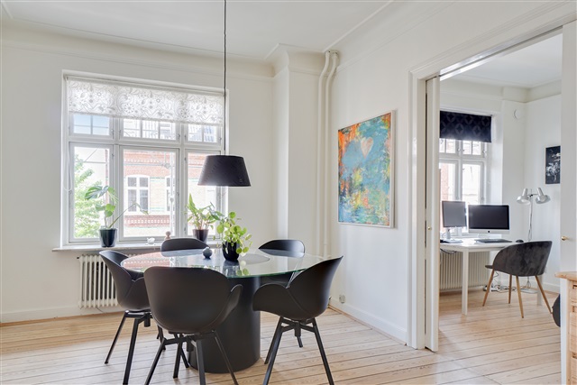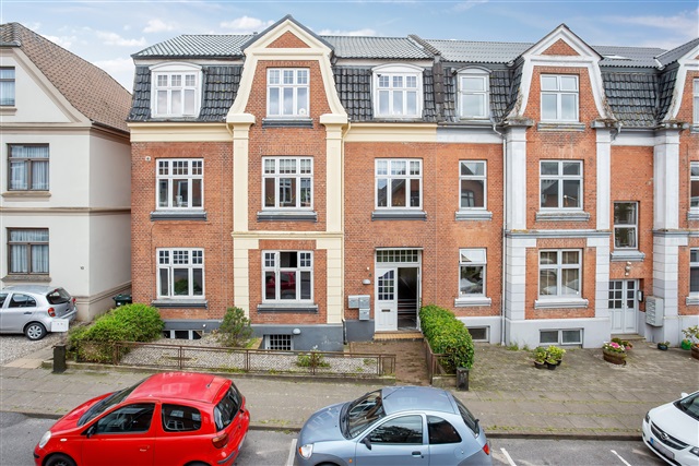 I velfungerende ejendom udlejes her stor og lys lejlighed. Lejligheden ligger i mindre ejendom hvor lejligheden her optager hele mellem-etagen. Lejligheden indeholder lille praktisk entre, stort køkken med diverse hvidevarer samt nyere badeværelse. Herudover to stuer en suite (den ene kan benyttes som værelse) samt stor soveværelse mod haven.Haven deles med ejendommens to andre lejligheder.