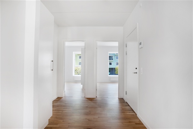Lejligheden fremstår som et lyst og rummeligt hjem, hvor klassiske byggematerialer er kombineret med moderne elementer. Det åbne køkken og stueområde ligger i forlængelse af hinanden og danner tilsammen et rummeligt miljø med et imponerende lysindfald. Køkkenet, der er fra Invita, er desuden udstyret med en "svævende" bordplade i højtrykskomposit, spot-LED-belysning og indbyggede hvidevarer fra Siemens. Fra entréen er der adgang til et indbydende badeværelse, som har gulvvarme, en integreret og formstøbt vask i marmor, væghængt toilet samt plads til vaskemaskine og tørretumbler. Det er muligt at søge om tilladelse til husdyrhold i samtlige lejemål. Bemærk at der ikke findes mål på plantegningen, så hvis man ønsker at opmåle lejligheden, må man medbringe eget måleudstyr ved fremvisningen.Vedrørende billederne skal det understreges, at de ikke viser den specifikke lejlighed, men er taget i en tilsvarende bolig med samme stil og standard. Der kan være forskelle i placeringen af vinduer, altaner eller terrasser samt radiatorer mellem boligerne, ligesom udsigten kan variere afhængigt af etage og boligplacering. Af denne grund kræver udlejer, at fremvisning altid foretages, inden der underskrives lejekontrakt, så man er fuldt informeret om det konkrete lejemål. Interesse for boligen eller ønske om fremvisning kan rettes til udlejningsteamet, eller man kan booke en tid direkte via lejemålets annonce.
