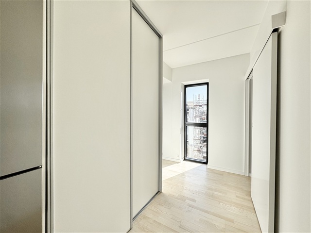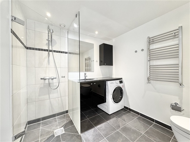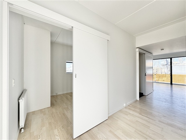 Fra entreen er der adgang til stort soveværelse med store skabe med skydelåger. Der er flot stort badeværelse med bruseniche, væghængt toilet, skabsplads, kombineret vaske-/tørremaskine samt gulvvarme.
