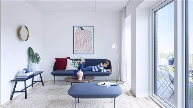 Lejligheden består af to værelser og byder på en rummelig stue, der åbner ud mod en solrig, sydvendt altan, som er stor nok til møblering. I direkte tilknytning til den veldimensionerede stue finder man et moderne Invita-køkken uden greb i hvidt design, som tilbyder rigeligt skabsplads samt alle nødvendige hårde hvidevarer. Soveværelset er udstyret med faste skabe og en praktisk niche, der egner sig til et arbejdsbord.Badeværelset fremstår med lyse beige fliser både på gulvet og i den rummelige bruseniche, hvor en stor brusekabine giver god plads. Her er pladsen udnyttet optimalt med både vaskemaskine, tørretumbler, opbevaringsmuligheder samt et væghængt toilet. I hele lejligheden pryder flotte lamelparketgulve, og de store vinduespartier sikrer et dejligt og naturligt lysindfald. Der er let adgang til et depotrum tilhørende lejligheden. Opvarmningen sker via gulvvarme, og ejendommen er tilsluttet fibernet. Det er muligt at søge om tilladelse til at holde ét husdyr i alle lejemålene, med undtagelse af katte i stuelejligheder.