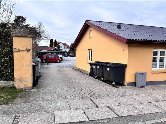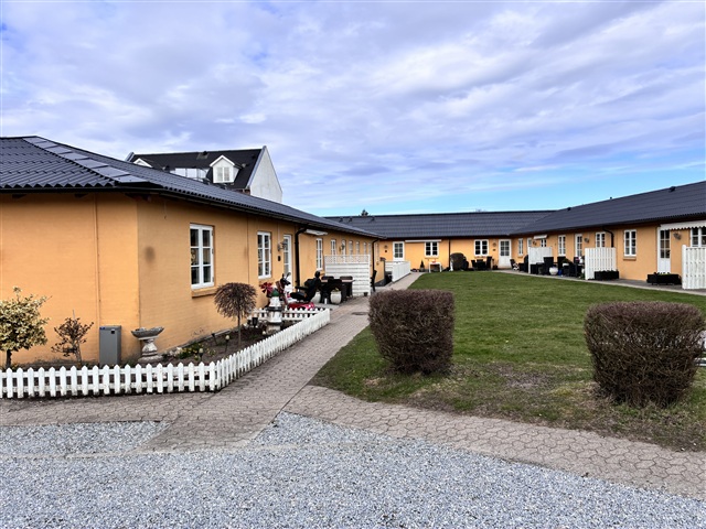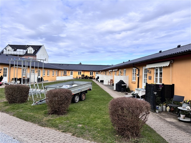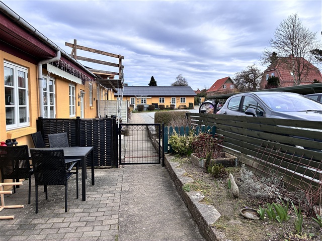 Rækkehuset er beliggende i en velholdt og passet bebyggelse, hvor der er lukket af og dejligt med privatliv. Foran boligen har man sin egen lille terrasse og i rækken mellem de 2 rækker af huse, findes yderligere et fællesareal med plæne. Et hyggeligt kvarter med gode fællesfaciliteter, såsom stor festsal med køkken og toilet, kælderrum, værksted og vaskeri. Der er også egen privat parkeringsplads tilknyttet.