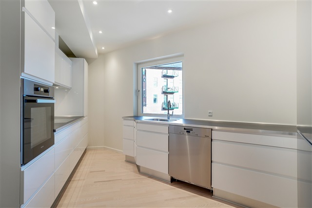 Køkkenet fremstår med højglans og indeholder alle nødvendige hvidevarer, inklusive opvaskemaskine, mens stuen byder på en åben og indbydende atmosfære. Overalt i lejligheden er der lagt flotte parketgulve, suppleret med gulvvarme, og der er installeret dørtelefon. Ydermere medfølger et kælderrum til opbevaring.