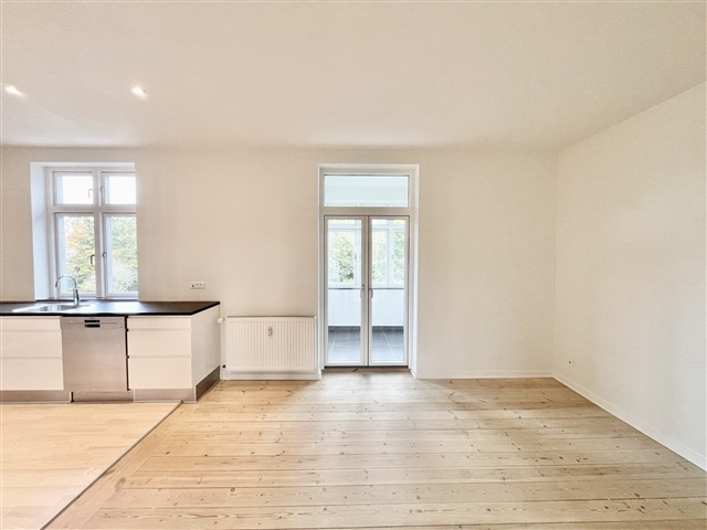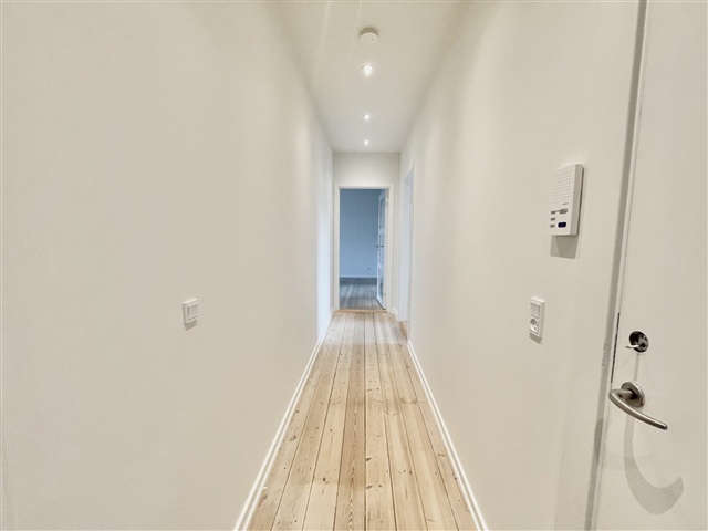 Derudover rummer boligen en stor og komfortabel stue samt to rummelige værelser, hvoraf det ene alternativt kan anvendes som en ekstra opholdsstue. Lejlighedens flotte, afhøvlede plankegulve bidrager til en tidløs atmosfære, og der er dørtelefon samt tilhørende kælderrum til rådighed. Derudover kan beboere nyde godt af adgang til et fælles, parklignende område. Mulighed for parkering findes i gården.