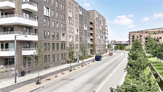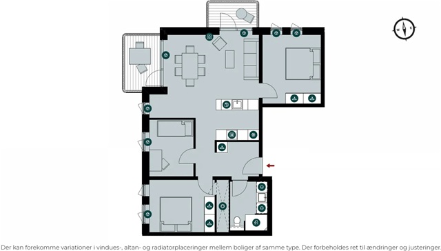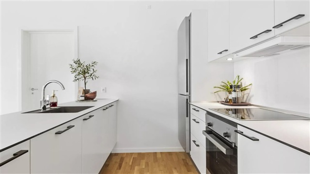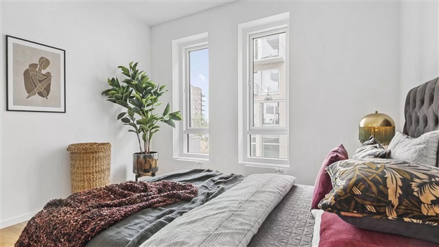 Lejligheden er disponeret med et rummeligt alrum, hvor køkken og stue smelter sammen og danner et åbent og lyst opholdsrum. Store vinduespartier sikrer indfald af dagslys gennem flere retninger, hvilket skaber en lys og indbydende stemning. Køkkenet er moderne og leveret af Invita, mens de hårde hvidevarer kommer fra Bosch Siemens. Hok til opbevaring findes blandt andet i det praktiske skabsrum i det store soveværelse. Fra entréen er der adgang til et stort, indbydende badeværelse, der blandt andet er udstyret med gulvvarme, en formstøbt vask i marmor, væghængt toilet samt en vaskesøjle. Fra stuen leder en udgang ud til en stor altan, som kan møbleres og fungerer som et privat frirum med god plads til både solskin og frisk luft. Det skal nævnes, at det er muligt at søge om tilladelse til at holde husdyr i samtlige lejemål. Bemærk, at der ikke foreligger mål på plantegningen, så ønsker du at tage mål af lejligheden ved en fremvisning, skal du medbringe eget måleudstyr.Fotos, der vises, illustrerer ikke den konkrete bolig, men stammer fra en anden lejlighed med tilsvarende stil og stand. Der kan derfor forekomme forskelle i placeringen af vinduer, altaner, terrasser og radiatorer mellem de enkelte boliger. Udsigten kan også variere, hvis billederne er taget fra en etage, der ligger anderledes i forhold til den specifikke lejlighed. Af den grund skal du altid deltage i en fremvisning, før en lejekontrakt kan underskrives, så der er sikkerhed om boligens faktiske udformning. Hvis denne bolig har interesse, kontakt venligst vores udlejningsteam eller book en fremvisning direkte.