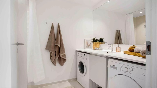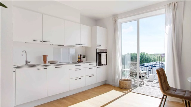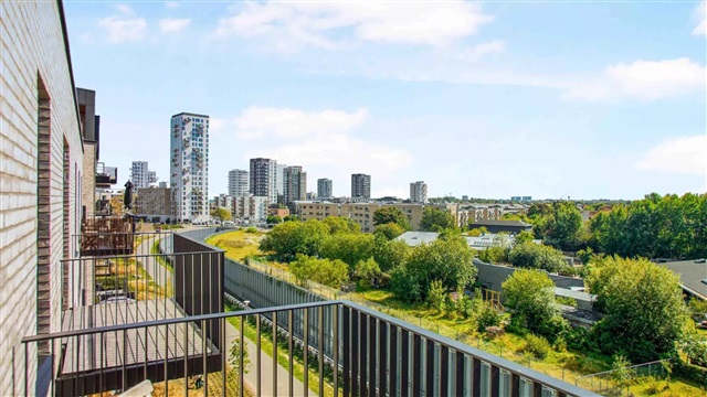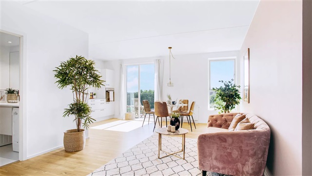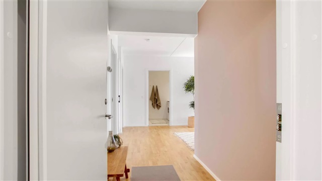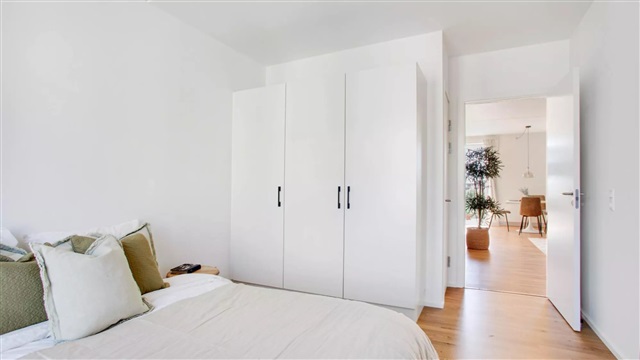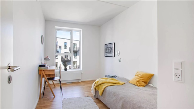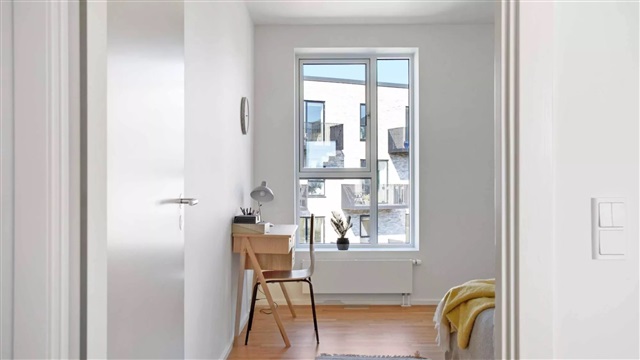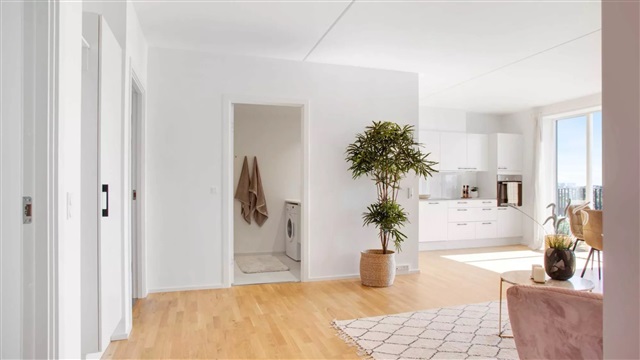 Lejligheden er udført i en skandinavisk designstil, som bidrager til et lyst, moderne og indbydende miljø. De store vinduespartier sørger for et rigt dagslysindfald, hvilket skaber en behagelig stemning og fremhæver det lyse egetræsgulvs spil. Midtpunktet i boligen er et åbent opholdsrum med køkken og plads til spisning. Køkkenet, der fremstår stilrent og hvidt, er leveret af Invita og udstyret med hårde hvidevarer fra Siemens. Badeværelset er beklædt med fliser på både gulv og i brusekabinen, og rummer desuden en vaskemaskine og tørretumbler, også fra Siemens. I det store soveværelse, det såkaldte mastersoveværelse, findes indbyggede skabe, som giver god opbevaringsplads. Mulighed for at søge om tilladelse til husdyr findes i samtlige lejemål. Bemærk venligst, at hvis du ønsker at måle lejligheden, skal du selv medbringe egnet måleudstyr under fremvisningen, da plantegningen ikke indeholder mål.Det skal understreges, at de anvendte billeder ikke viser netop denne lejlighed, men en tilsvarende bolig med samme type og stand. Der kan forekomme forskelle i placeringen af vinduer, altan eller terrasse samt radiatorer mellem de enkelte lejligheder. Ligeledes kan udsigten variere afhængigt af, om det viste billede er taget fra en lidt højere eller lavere etage end den aktuelle lejlighed. Derfor stilles der krav om, at du deltager i en fremvisning før underskrivelse af lejekontrakten, så du har fuld klarhed over boligens udformning. For interesse eller booking af fremvisning kan du kontakte udlejningsteamet eller bestille tid direkte via annonceringen.