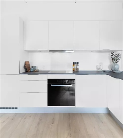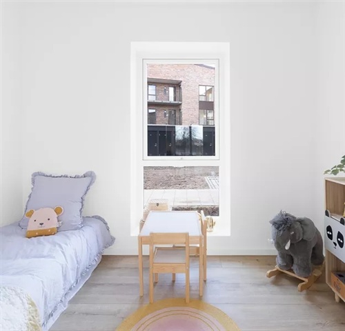 Denne fireværelses lejlighed byder på et rummeligt køkken-alrum, velindrettede værelser, et moderne badeværelse og en privat altan. Hertil følger også et særskilt skur til opbevaring.Lejlighedens hjerte er det lyse køkken-alrum, hvor det hvide HTH-køkken er placeret i en vinkel, der skaber en naturlig opdeling mellem madlavningsområdet og stuemiljøet. Køkkenet er fuldt udstyret med alle nødvendige hårde hvidevarer, og der er rigelig plads til både et spisebord og en sofagruppe. Fra alrummet er der adgang til soveværelset, der er forsynet med tre faste skabe og godt med plads til en dobbeltseng. Derudover er der to lige store værelser placeret ved siden af hinanden; begge har garderobeskabe og er store nok til at rumme både seng og skrivebord.