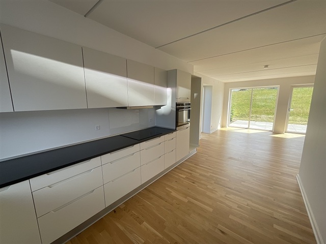 Køkkenerne er udført i hvide elementer med laminatbordplade, emhætte, kogeø med induktion og indbygningsovn med varmluft og pyrolyse, der er installeret køl/frys i udvalgte boliger.
