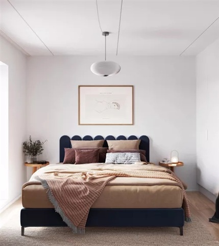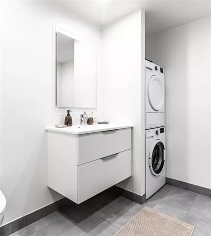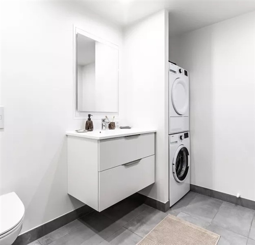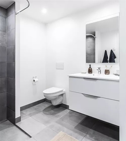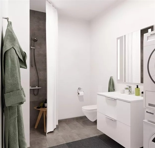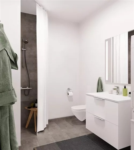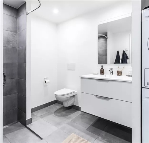 Soveværelset rummer to indbyggede garderobeskabe og har tilstrækkelig plads til en stor seng. Badeværelset er enkelt indrettet med brusehjørne, toilet, håndvask og opbevaringsmuligheder, og det er desuden udstyret med en vaskesøjle, som indeholder både vaskemaskine og tørretumbler.