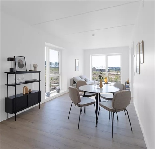 Entréen byder på et fast integreret skab til opbevaring, og herfra er der adgang til det store køkken-alrum. Fra stuen er der udgang til den private altan eller terrasse, hvor man kan nyde frisk luft.