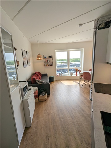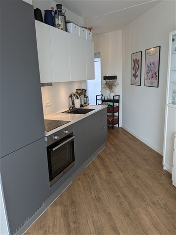 Denne lejlighed byder på attraktive materialevalg og er udstyret med komplette hårde hvidevarer. Køkkenet er udført i en elegant grå nuance, hvilket skaber et stilrent udtryk. Boligen egner sig særligt godt til en enkelt person, der ønsker et enkelt og funktionelt hjem. Komforten er i fokus med gulvvarme installeret overalt samt et Genvex ventilationssystem, som sikrer et behageligt indeklima.Lejligheden rummer et køkken, hvor der er plads til et spisebord, samt et soveværelse og et flot badeværelse udstyret med en kombineret vaskemaskine og tørretumbler. Køkkenets udstyr inkluderer en integreret ovn, emhætte, glaskeramisk kogeplade, et køle- og fryseskab samt en opvaskemaskine.