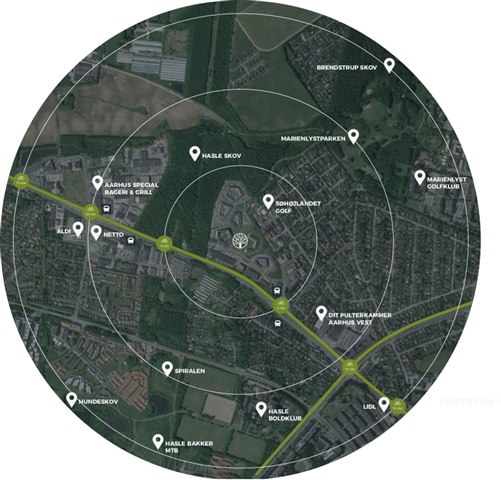 Boligen ligger tæt på naturlige omgivelser og har let adgang til offentlig transport samt dagligvarebutikker. Aarhus Universitetshospital er inden for cykelafstand, og du får en fremragende placering tæt på både Aarhus Centrum med byens liv og studieliv, samtidig med at der kun er en kort gåtur til grønne, naturskønne områder.