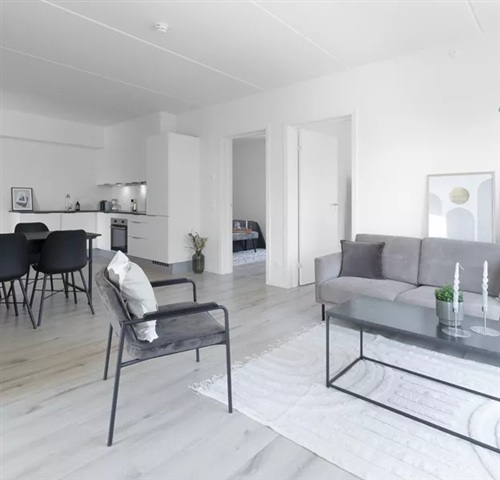 Køkken og stueLejlighedens stilrene køkken er stort og rummeligt og indeholder både vinkelformet køkken med alt i hårde hvidevarer, spiseplads, stue samt masser af luft omkring møblerne.VærelserLejligheden har hele fire værelser, hvilket gør mulighederne mange for boligen. Her er både plads til børnefamilien, venner der deler en bolig samt parret eller senioren, der ønsker masser af plads. Værelserne er indrettet med henholdsvis et enkelt garderobeskab på tre af værelserne og hele tre faste skabe i det store soveværelse.BadeværelseLejligheden indeholder et enkelt og moderne bad med bruseniche, toilet, håndvask med skabsopbevaring og vaskesøjle.AltanDet er muligt at nyde solrige timer på lejlighedens egen terrasse, der ligger i forbindelse med stuen.