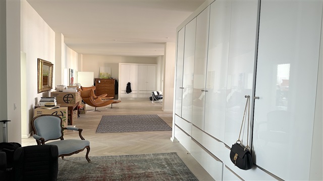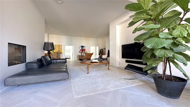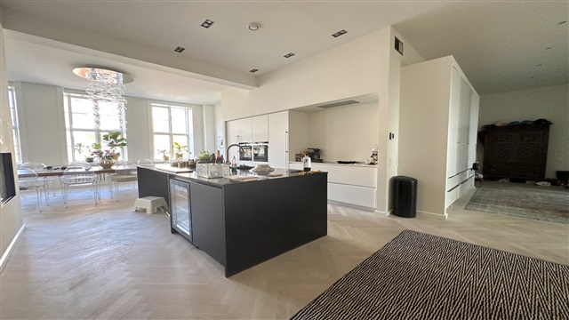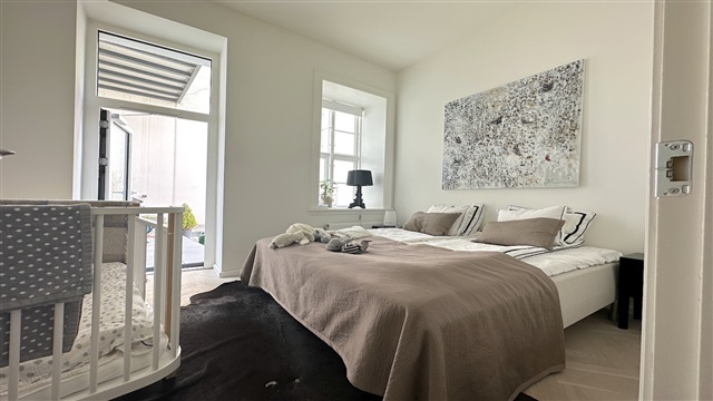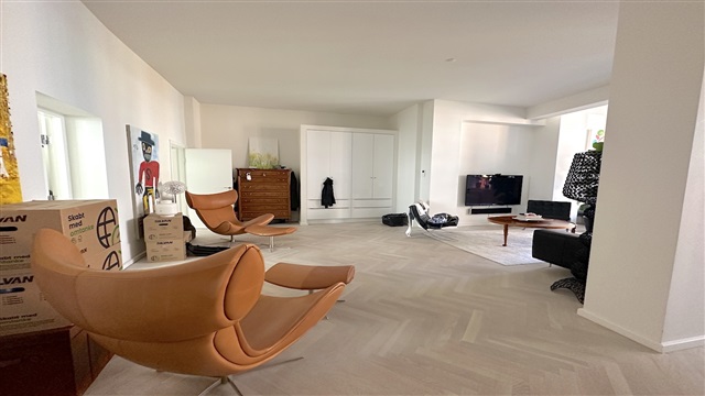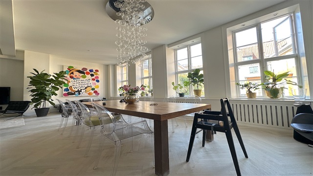 På første sal i denne charmerende ejendom udbydes en rummelig fireværelses lejlighed med et areal på 242 m² til leje. Boligen byder på en entré med integrerede skabe, som åbner op til både et gæstetoilet og et stort badeværelse, udstyret med blandt andet et badekar samt en stor bruseafdeling med dobbelte bruserhoveder. Fra entréen ledes man videre til lejlighedens tre soveværelser, placeret på venstre side, hvorfra der er udsigt til en omfattende privat terrasse og gårdhave.På højre side af entréen ligger et rummeligt køkken, som er fuldt udstyret med hårde hvidevarer, herunder opvaskemaskine, Quooker, dampovn samt vinkøleskab. Køkkenet har rigelig plads til en stor spiseplads. En elegant skillevæg med en indbygget, gennemgående gaspejs adskiller køkkenet fra stuen, hvor store vinduespartier sikrer et dejligt lysindfald både i køkken- og opholdsområdet. Lejligheden er gennemgående prydet med smukke parketgulve, og der findes desuden et mindre rum til vaskemaskine og tørretumbler.