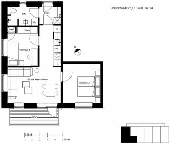 Bemærk venligst: Billederne kan stamme fra andre lejligheder i ejendommen, men materialevalg og kvalitetsniveau er ens i alle boliger. Plantegningen viser boligens indretning.