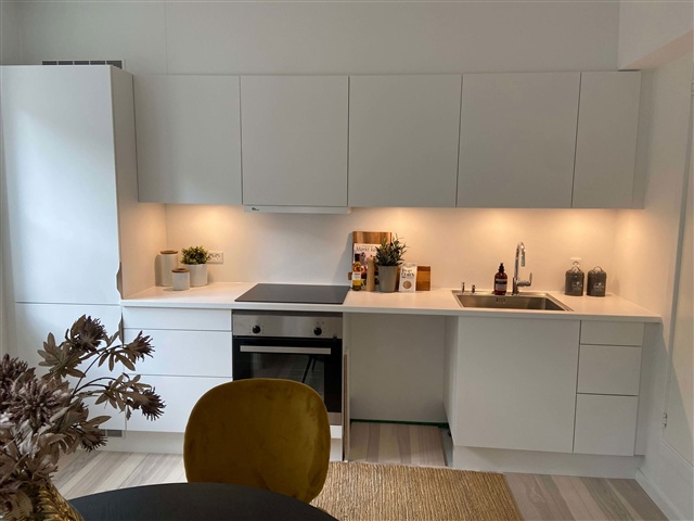 Boligerne er nybyggede og udført i et moderne design med slidstærke, vedligeholdelseslette materialer i lyse og luftige farvetoner. Hver bolig indeholder et lyst og indbydende køkken/alrum, som er i åben forbindelse med en hyggelig stue, der har adgang til enten en terrasse eller en altan. Køkkenet er en Next-model fra HTH, som med sine enkle og rene linjer skaber et tidløst udtryk. Alle hårde hvidevarer er fra Siemens og inkluderer indbygningsovn, induktionskogeplade samt integreret opvaskemaskine og køle-/fryseskab. Badeværelserne fremstår lyse og moderne; de er indrettet med bruseniche, skabe, vask og gulvvarme, og her findes også egen vaskemaskine samt tørretumbler. Der er installeret gulvvarme i hele boligen, og samtlige opgange har elevator, hvilket gør boligerne velegnede til alle aldersgrupper. Desuden følger der et rummeligt depotrum med til hver bolig. Billederne stammer fra en prøvebolig.Fra boligerne får man udsigt til hovedbygningen, som er opført i 1916 efter tegning af arkitekt Poul Holsøe. Denne tidligere herskabsbolig har været anvendt med repræsentative og opholdsrum i stueetagen, mens 1. sal har indeholdt soveværelser og tjenestefolk. Hovedbygningen er restaureret med stor respekt for den oprindelige arkitektur, hvor flere fine detaljer stadig er bevaret, herunder den bevaringsværdige hoveddør, kassetteloft, originalt snedkerarbejde samt en egetræstrappe, som fører til 1. sal. Den restaurerede bygning rummer nu i alt otte herskabslejligheder.