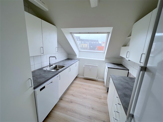 Denne 4-værelses lejlighed er netop blevet gjort klar til genudlejning. Lejligheden blev totalrenoveret for 2 år siden, og er netop blevet nymalet og ordnet køkken, og fremstår i rigtig flot stand. I forbindelse med renoveringen, blev der blevet tilføjet et nyt stort værelse til lejligheden, så den nu rummer 3 gode værelser og en stor stue foruden helt nyt køkken samt helt nyt badeværelse. Lejligheden leveres med nye hårde hvidevarer i køkkenet. Med sine 85 m2 er der god plads i alle rum til at sætte eget præg på indretningen - både til parret, familien eller til singlen.Ejendommen huser to yderligere boliglejemål, samt et butikslejemål i stueetagen. I baggården finder man i Baghuset, der i dag benyttes til kontor, som med sit bindingsværk er med til at skabe en hyggelig stemning.