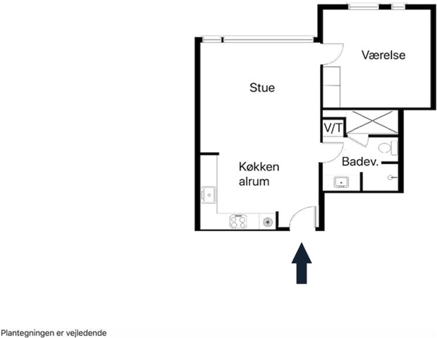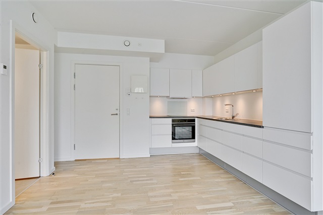 Lejligheden er indrettet med entré, med plads til det daglige overtøj, sko osv. Herfra er der adgang til stue samt boligens køkken alrum. Her er plads til både sofagruppe samt spisebord. De store vinduer tilføjer mere dybde til rummet, og giver både lys og varme som hurtigt fornemmes på en solrig dag. Køkkenet er udstyret med alle nødvendige hårde hvidevarer – opvaskemaskine, ovn, kogeplader og emhætte. Ligeledes er der godt med skabs- og skuffeplads.