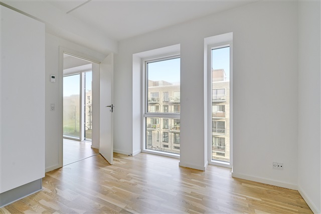 Boligens soveværelse er indrettet med store vinduer, højt til loftet og skabsplads til tøj og yderligere opbevaring.