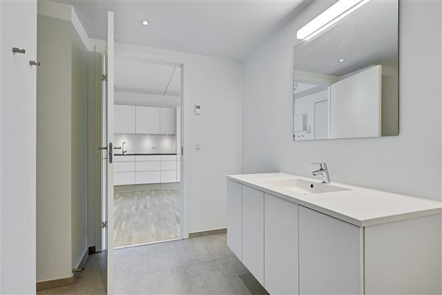 Badeværelset er indrettet med lyse sandfarvet fliser og hvide vægge samt elementer. Her er også vaskemaskine og tørretumbler. Gennemgående for hele lejligheden er selvfølgelig gulvvarme i alle rum, højt til loftet, ro og afslappethed.
