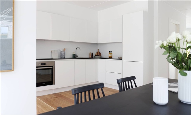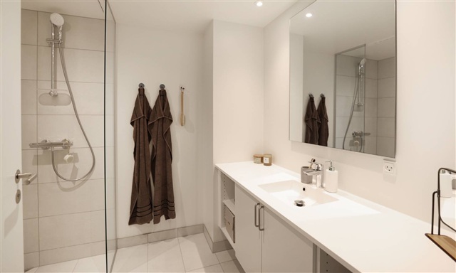 Vær opmærksom på, at billederne kan stamme fra en anden bolig i samme ejendom, så indretning, beliggenhed og udsigt kan variere, men materialevalg og kvalitetsniveau er ens for alle boliger i komplekset. For at se netop denne boligs planløsning, henvises til plantegningen.