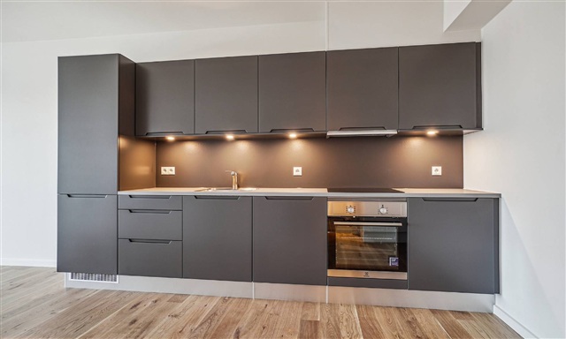 Det skal bemærkes, at de viste billeder ikke nødvendigvis repræsenterer denne nøjagtige lejlighed, men materialevalg og kvalitetsniveau er ensartet for alle boliger i ejendommen. En plantegning over boligens indretning findes tilgængelig.
