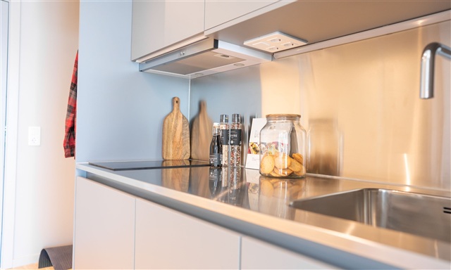 Denne specialudformede lejlighed på én værelse byder på en række praktiske løsninger kombineret med en dejligt stor altan, som giver god plads. Køkkenet fremstår elegant og er indrettet med et stort antal skabe, hvilket sikrer rigeligt med opbevaringsplads, og alle nødvendige hårde hvidevarer er inkluderet, herunder opvaskemaskine. Der er desuden en mindre spiseplads med en ekstra tillægsplade, så der kan dækkes op til flere personer. Sovepladsen består af en sovesofa, som både er komfortabel og funktionel samt tilbyder en fremragende opbevaringsløsning. Desuden rummer lejligheden flere opbevaringsmuligheder i form af skabe og skuffer med klikfunktion. En fleksibel arbejdsplads er også til stede i form af et flexdesk, som kan anvendes både som et skrivebord og en hyggelig siddeplads. Badeværelset er udstyret med gulvvarme, har et lyst klinkegulv og byder desuden på en separat bruseniche i det rummelige rum. Det er en bolig, der bør opleves for at værdsættes fuldt ud.