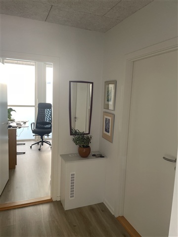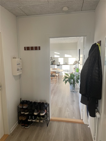 Desuden regulært værelse, entré med dør ind til flot badeværelse med grå klinker på gulv og i bruseniche. Håndvask nedfældet i bordplade og med underskabe. På badeværelset er der klargjort og plads til vaskemaskine.