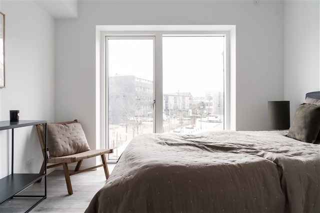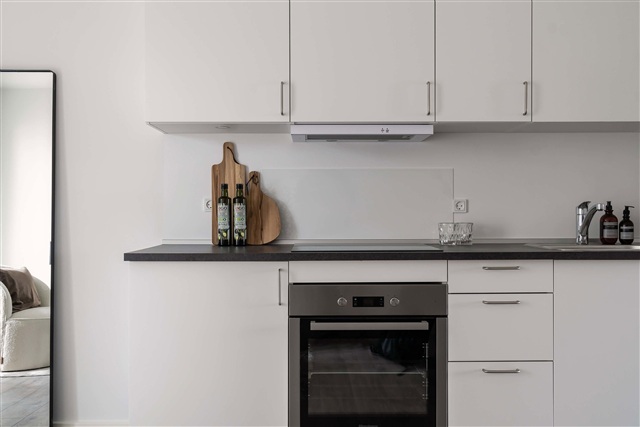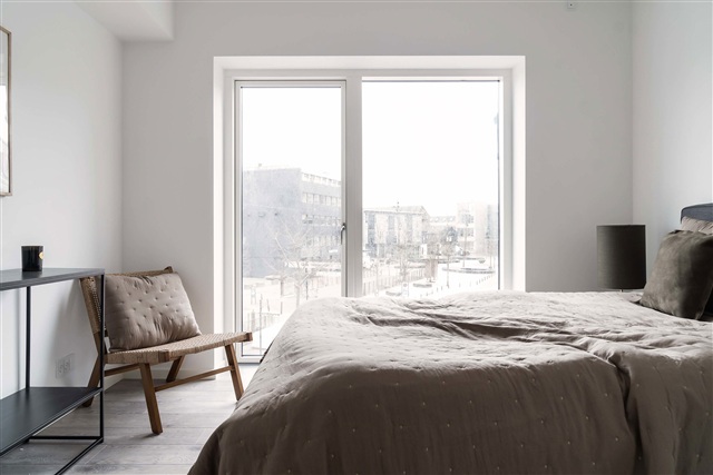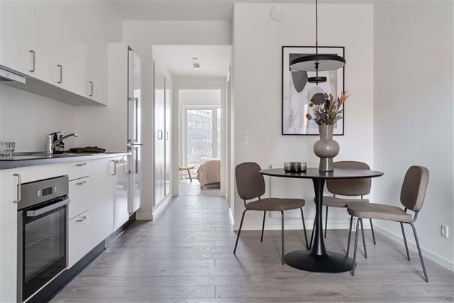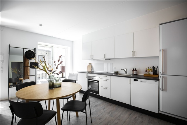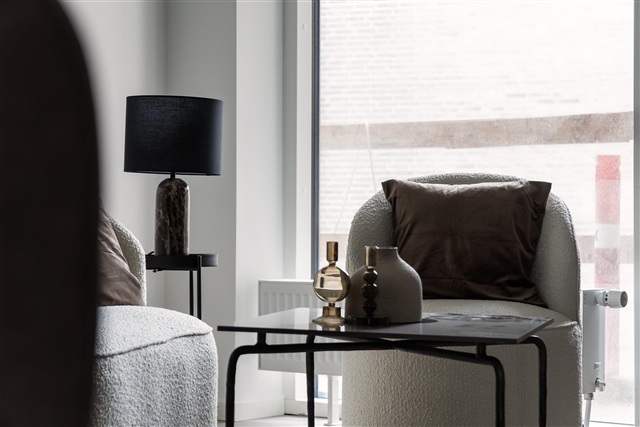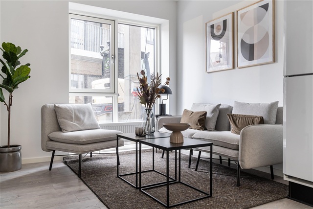 Indretningen i lejlighederne er karakteriseret ved højt til loftet, rå, hvide facader og laminatgulve med et børstet plankegulvsudtryk. Det åbne køkken-alrum og stuen glider elegant sammen i et aflangt rum, der trods et separat soveværelse giver en fornemmelse, som var du i en New Yorker loftlejlighed. Begge lejlighedens ender, både stue og soveværelse, rummer store gulv-til-loft vinduer, hvilket sammen med de lyse overflader sikrer en rummelig og lys atmosfære. Køkkenet matcher den minimalistiske stil med hvide elementer, en sort laminatbordplade samt greb, vask og hvidevarer i rustfrit stål. De samme materialevalg går igen på badeværelset, hvor vask, greb og brusesæt alle er udført i stål og bidrager til det gennemførte udtryk.