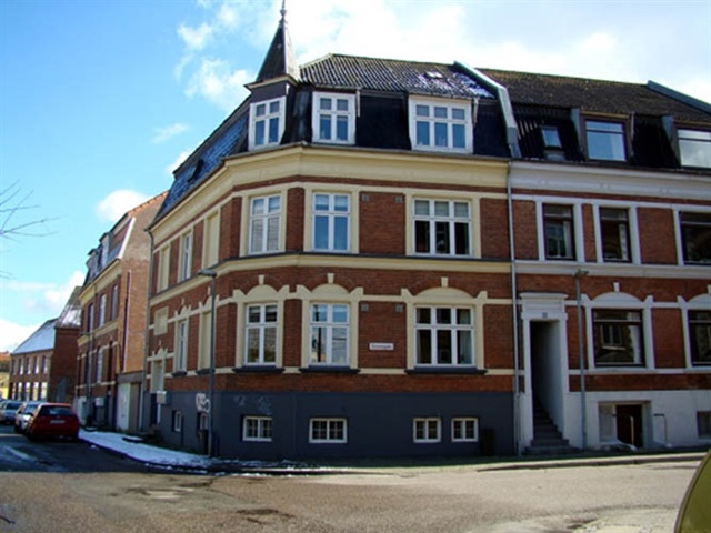 Denne lejlighed til leje på anden sal i Koldings centrum ligger i en velholdt hjørneejendom, hvor der kun findes to andre lejligheder af samme størrelse, begge med tre værelser. Til ejendommen hører et mindre fælles gårdmiljø, hvor det er muligt at grille i sommerperioden. Parkering kan ske langs gaden i nærheden.