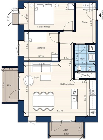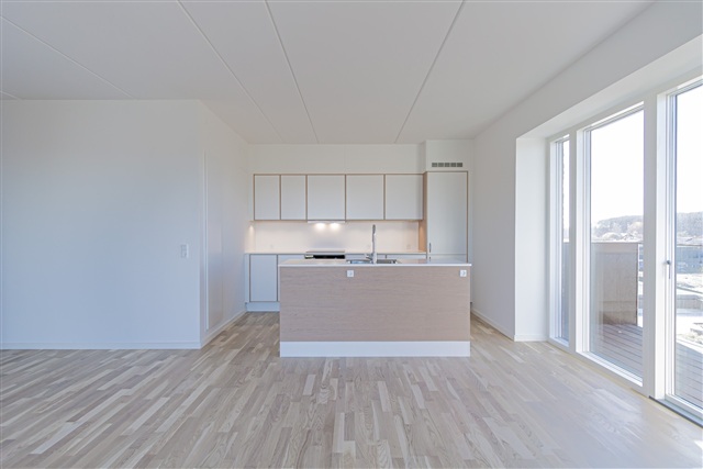 Denne nyopførte 3-værelses lejlighed med gulvvarme i alle rum byder på et attraktivt køkken-alrum med køkkenø med udgang til begge af boligens altaner. Det stilrene Invita-køkken er holdt i lyse farver og fuldt udstyret med hårde hvidevarer, som gør din tid i køkkenet ekstra bekvem. I direkte forlængelse af køkkenet ligger stuen, og derudover har boligen to værelser med fransk altan i soveværelset.