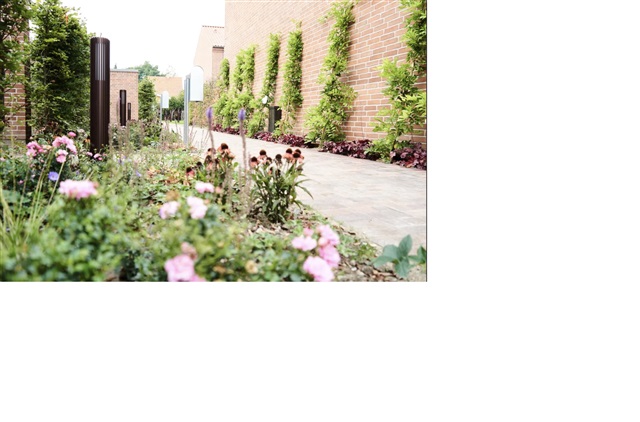 Et gennemført område med veludførte gangstier med flotte belægningssten, grønne planter, Kompan-legeplads og stor parkeringsplads.