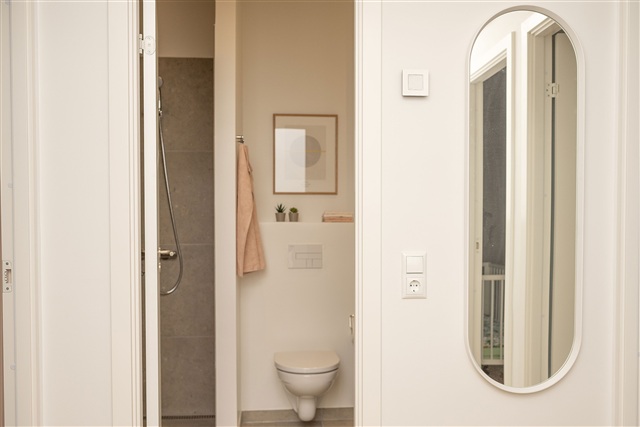 På førstesalen er der fire rummelige værelser, alle forsynet med integrerede skabe, hvilket gør indretningen let og funktionel. Denne etage indeholder også et andet badeværelse, hvor der er installeret vaskesøjle med både vaskemaskine og tørretumbler. Den øverste etage er kendetegnet ved et fantastisk lysindfald, der skaber lyse og behagelige rum.